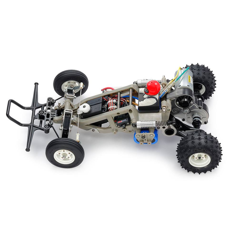 The Tamiya The Frog (HC-58354) brings back the iconic 1983 2WD racing buggy with thoughtful updates while preserving its distinctive space-frame design. This engaging build kit retains the sleek polycarbonate body and classic stance, enhanced with refined suspension and drivetrain components for confident off-road running.