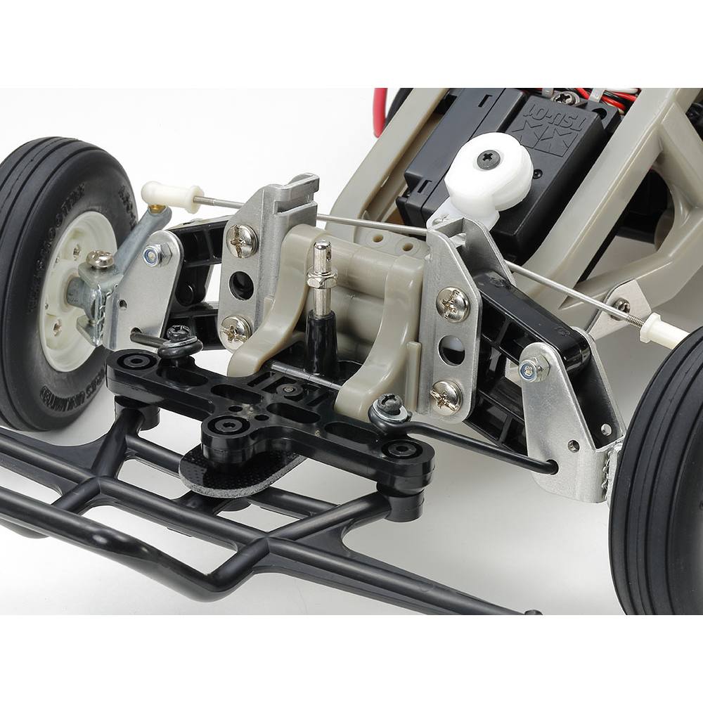 A sealed differential gearbox supports high-speed cornering and durability, backed by full gearbox ball bearings and a selectable 3-step gear ratio to tailor transmission efficiency. The re-designed dogbone-style drivetrain, complete with original rubber boots, delivers secure power transfer to the 3-piece wheels. Straight ribbed front tyres and high-grip rear spiked tyres provide dependable traction across mixed off-road surfaces.