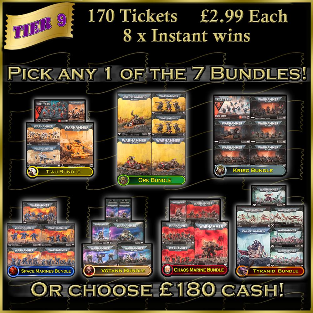 Tabletop Tombola. Wargame Competitions. The Choice is Yours. Tier 9 Army Bundles. Choose from Krieg, Tyranid, Tau and Seraphon or cash alternative