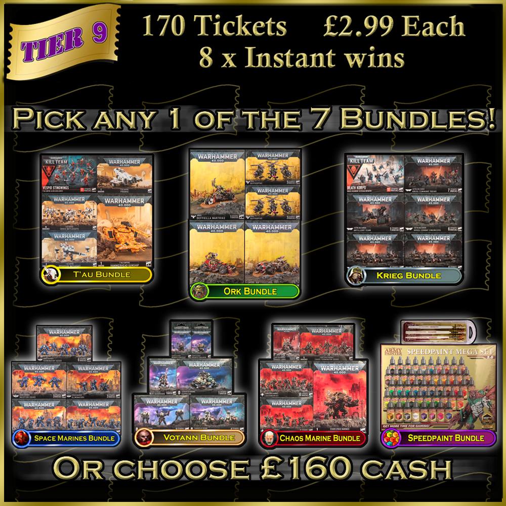 Tabletop Tombola. Wargame Competitions. The Choice is Yours. Tier 9 Army Bundles. Choose from Krieg, Tyranid, Tau and Seraphon or cash alternative