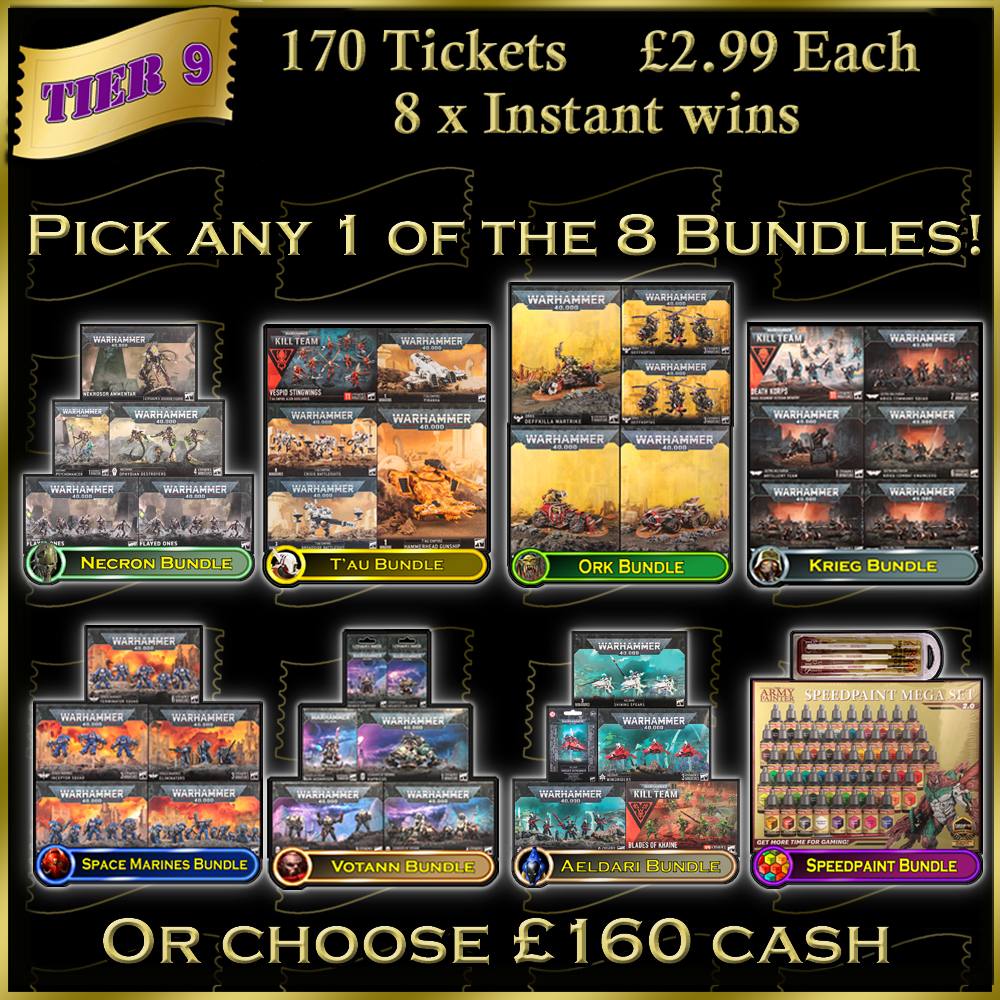 Tabletop Tombola. Wargame Competitions. The Choice is Yours. Tier 9 Army Bundles. Choose from Krieg, Tyranid, Tau and Seraphon or cash alternative