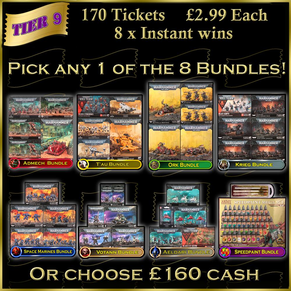 Tabletop Tombola. Wargame Competitions. The Choice is Yours. Tier 9 Army Bundles. Choose from Krieg, Tyranid, Tau and Seraphon or cash alternative